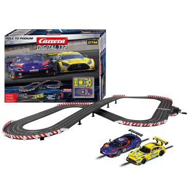 O novo conjunto Carrera DIGITAL 132 "Do Pólo ao Pódio" traz o DTM para a sala de estar. O Ferrari 296 GT3, pilotado pelos pilotos Jack Aitken e Thierry Vermeulen pela Emil Frey Racing na temporada de 2023, e o Mercedes-AMG GT3 Evo "Mercedes-AMG Team HRT, nº 4", com o qual Luca Stolz conquistou o 6º lugar na classificação geral de 2023, se encontram a 7,6 metros. A ação de corrida absoluta é garantida na pista da Carrera: as retas rápidas permitem uma condução a todo vapor, enquanto as curvas e os pontos duplos exigem um instinto seguro. Com os controles manuais WIRELESS 2.0, os pilotos da Carrera desfrutam de liberdade de movimento irrestrita. O coração bate mais rápido quando os pilotos assumem o controle. A emoção aumenta a cada ultrapassagem e drift emocionante. Milissegundos fazem a diferença entre a vitória e a derrota, e cada volta traz novos desafios e descargas de adrenalina. Os pilotos sentem a emoção enquanto lutam por cada centímetro e competem em duelos eletrizantes com os amigos.