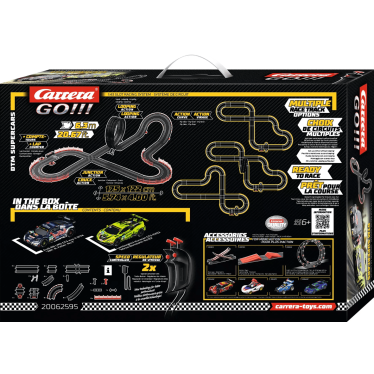 O conjunto Carrera GO!!! DTM Supercars traz o mundo emocionante do DTM direto para sua casa: na pista de 6,3 metros de comprimento, o Audi R8 LMS GT3 Evo II DTM "R. Feller, nº 7" e o Lamborghini Huracán GT3 Evo II "Mirko Bortolotti, nº 92" se enfrentam. Ambos os supercarros em escala 1:43 travam duelos de tirar o fôlego em uma pista de corrida com looping, viaduto, cruzamento e curvas desafiadoras. O controle manual turbo garante a velocidade perfeita, enquanto o controle preciso e as manobras emocionantes em trechos estreitos aprimoram a experiência de corrida. Seja nas longas retas ou em corridas rápidas pelo looping, este conjunto traz muita emoção e ação autêntica do automobilismo ao mundo Carrera GO!!!.