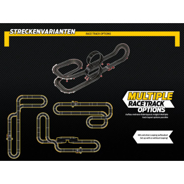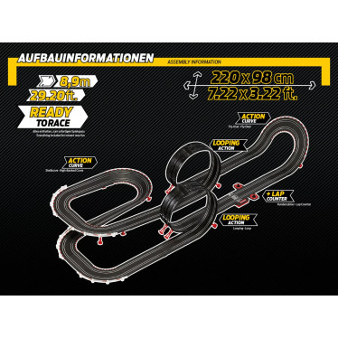 - Inclui contador de voltas, curvas inclinadas, loops e um viaduto