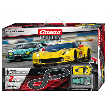 O conjunto Carrera Evolution 'Super Cars' apresenta uma batalha de duas feras velozes! O Chevrolet Corvette C7.R 'No.3' com Jan Magnussen, Antonio Garcia e Jordan Taylor contra o Lamborghini Huracán GT3 'Konrad Motorsport, No.7' dirigido por Axcil Jefferies e Michele Di Martino garante uma impressionante potência na pista. O Lamborghini turquesa nº 7 e o Chevrolet nº 3 cinza metálico e pintado de amarelo não conhecem concessões!