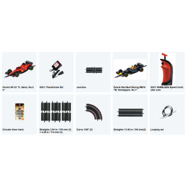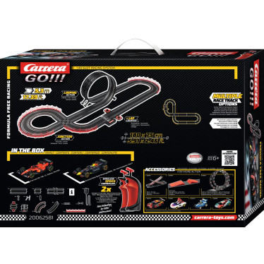 O conjunto Carrera GO!!! "Formula Free Racing [Wireless]" é sinônimo de pura diversão e liberdade de movimento, pois os famosos controles manuais Carrera dispensam cabos – permitindo que os pequenos fãs com 6 anos ou mais acompanhem a grande corrida de todos os ângulos da pista e se juntem à emoção. Emoção e diversão são a ordem do dia na pista de 5,3 metros, com o loop e as curvas desafiadoras proporcionando muita ação. Nos cruzamentos, os jovens pilotos precisam estar atentos para vencer os adversários. Com a Ferrari SF-23 "C. Sainz" e a Red Bull Racing RB19 "M. Verstappen", dois verdadeiros pesos pesados da Fórmula 1 estão na linha de largada, determinados a não deixar a vitória escapar.