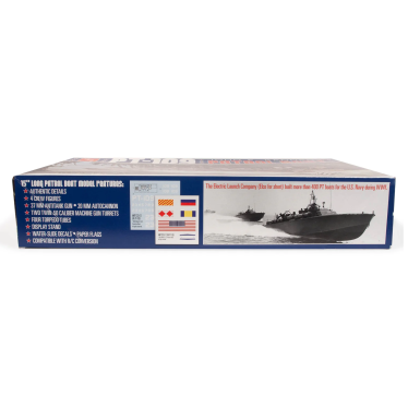 O Barco Patrulha em escala 1/64 da AMT representa o tipo de embarcação comandada por John F. Kennedy durante seu serviço na Segunda Guerra Mundial. Um encontro com um cruzador japonês resultaria em uma provação angustiante que rendeu a Kennedy diversas medalhas de reconhecimento. Este kit de modelo para colar oferece uma ótima experiência de construção para modelistas iniciantes, mas também oferece desafios suficientes para modelistas experientes. Inclui uma folha de decalques em toboágua e uma base de exposição.